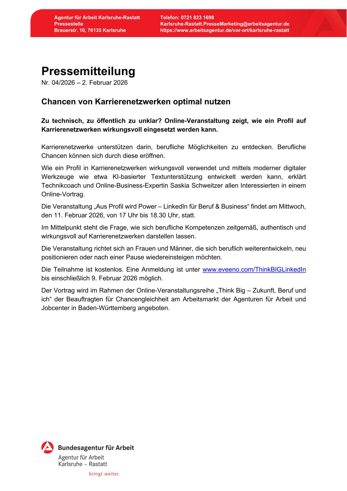 E-Mail: Karlsruhe-Rastatt.PresseMarketing@arbeitsagentur.de
