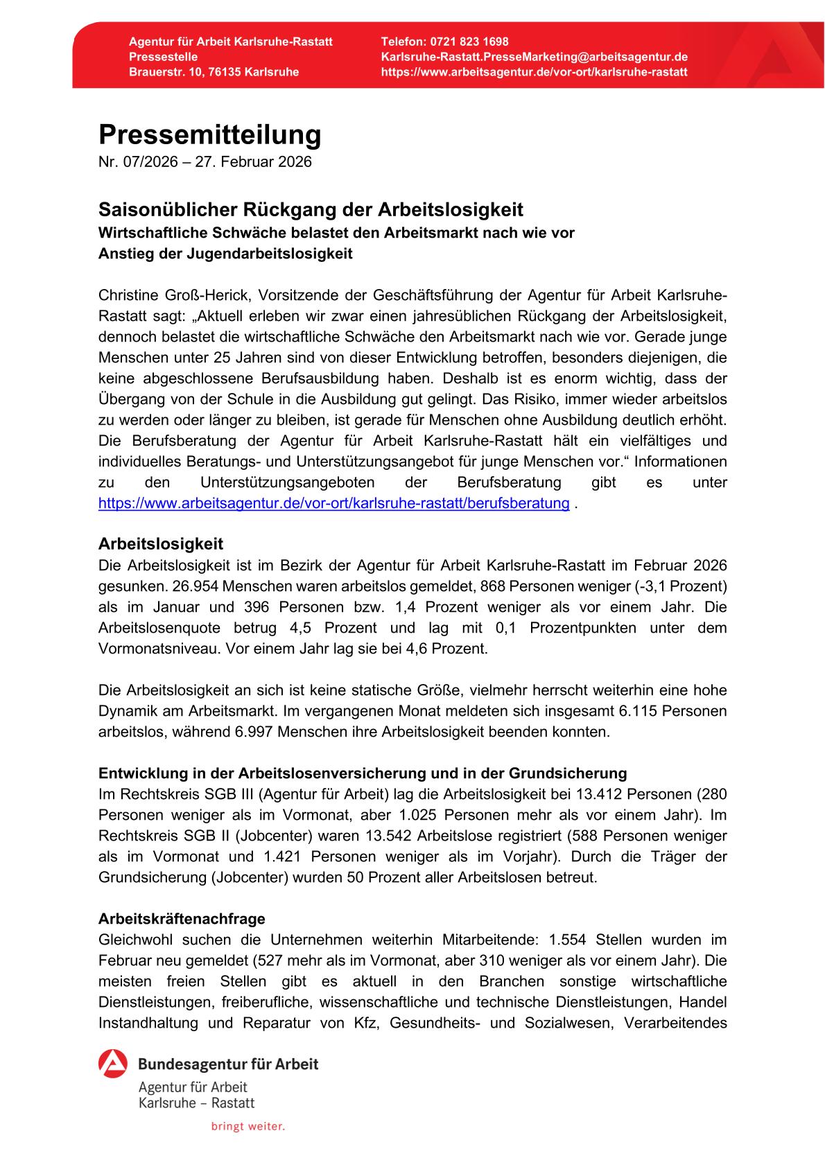Pressemitteilung Nr. 07/2026 – 27. Februar der Agentur für Arbeit Karlsruhe-Rastatt