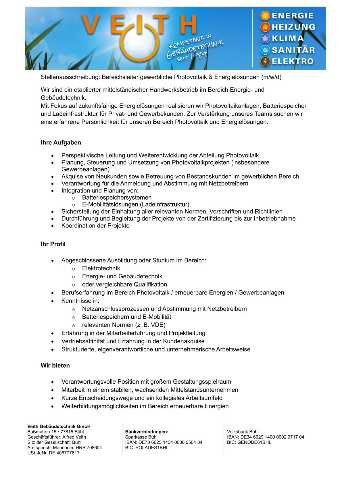 Bereichsleiter gewerbliche Photovoltaik & Energie (m/w/d)